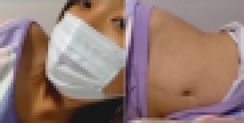 ベッドに横たわりシャツをめくり上げてへそ出しサービス、曲線美が素晴らしい中々のボディラインです。
