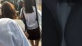 スベスベな肌、座り込んだ女性のスカートの中身、